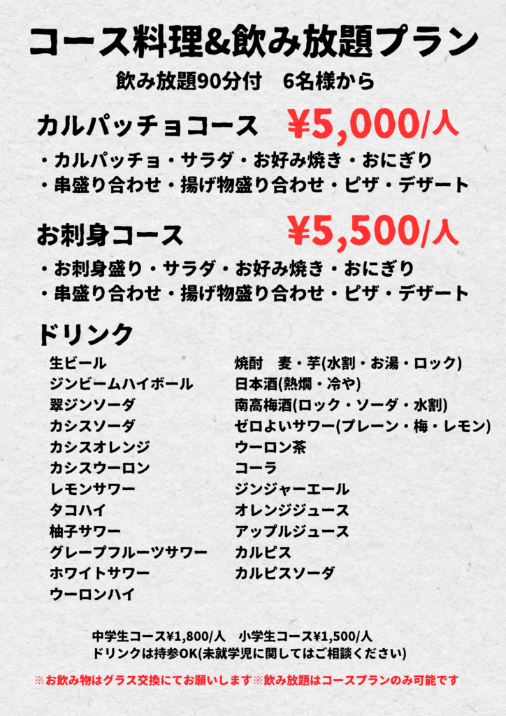・コース&飲み放題付きプランは6名様よりご利用可能です。事前にご予約ください。・コース飲み放題はい90分とし、以降の注文は単品にて承ります。・来店時間は厳守にてお願いいたします。
